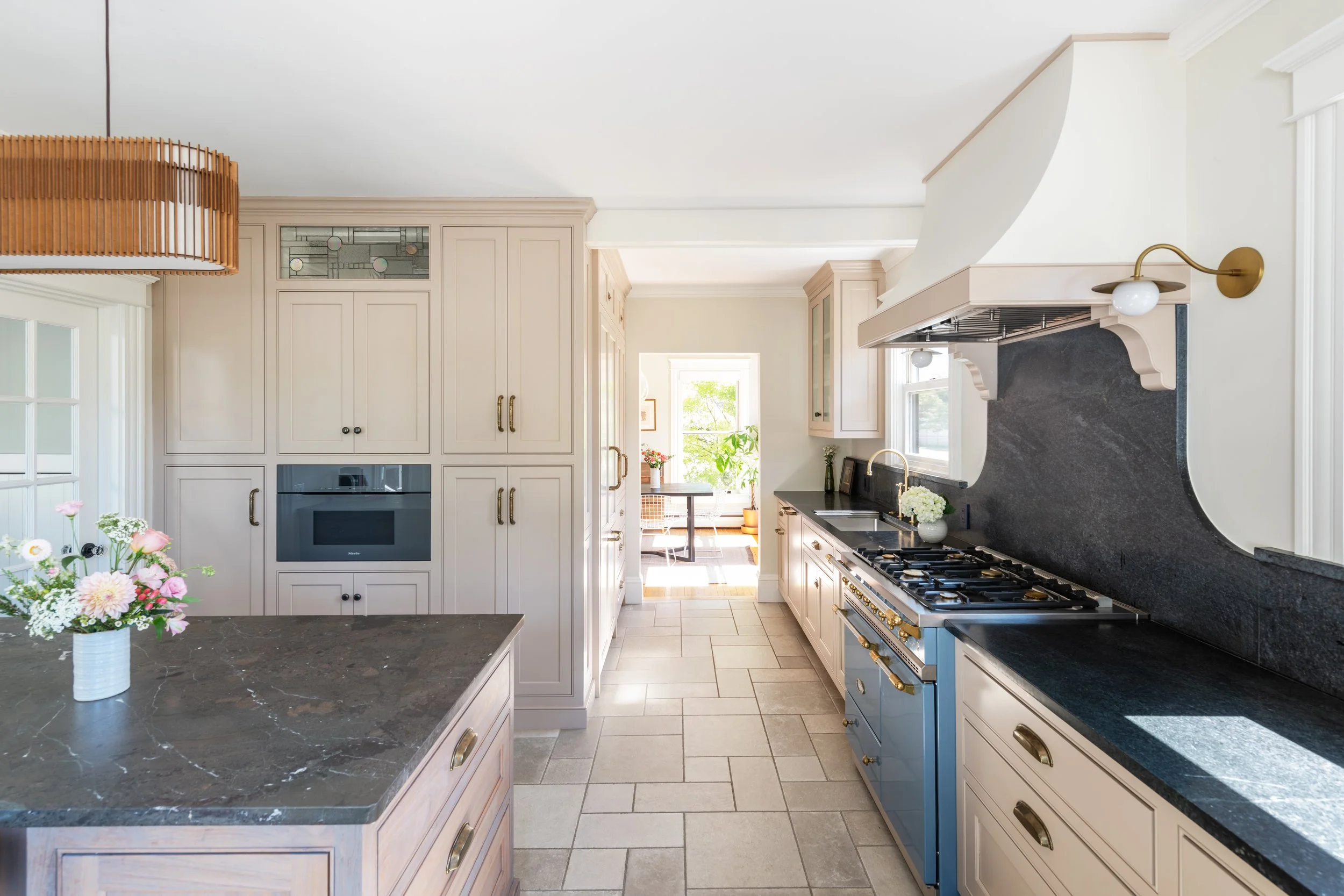 While function played a role, form drove the bus. In turn, a dramatic swooping soapstone backsplash frames a denim blue Lacanche range, and like artisan jewelry, Rocky Mountain’s unlacquered brass hardware adds texture and depth. The beaded inset walnut island, rubbed with a greige Rubio Monocoat finish, and a leathered Breccia marble countertop add more unusual shades that warm the heart of the home. At every turn, this space reveals unique and thoughtful design choices resulting in a kitchen that is all at once functional, inviting and sophisticated.